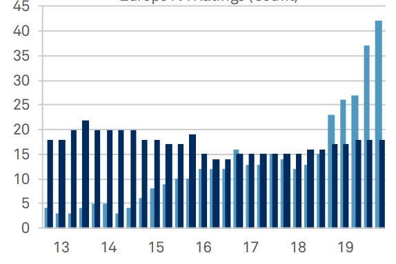 Procentul companiilor zombie, listate și nelistate la burse de valori europene